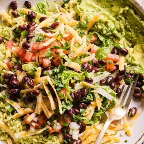 If there is one thing you know about me, its that I love a burrito bowl!! Specifically one loaded with all the best flavors and textures and an incredibly amount of guacamole. And trust me when I say, this Green Rice Burrito Bowl is next-level! The secret? A game-changing green rice that will have you licking the bowl clean.