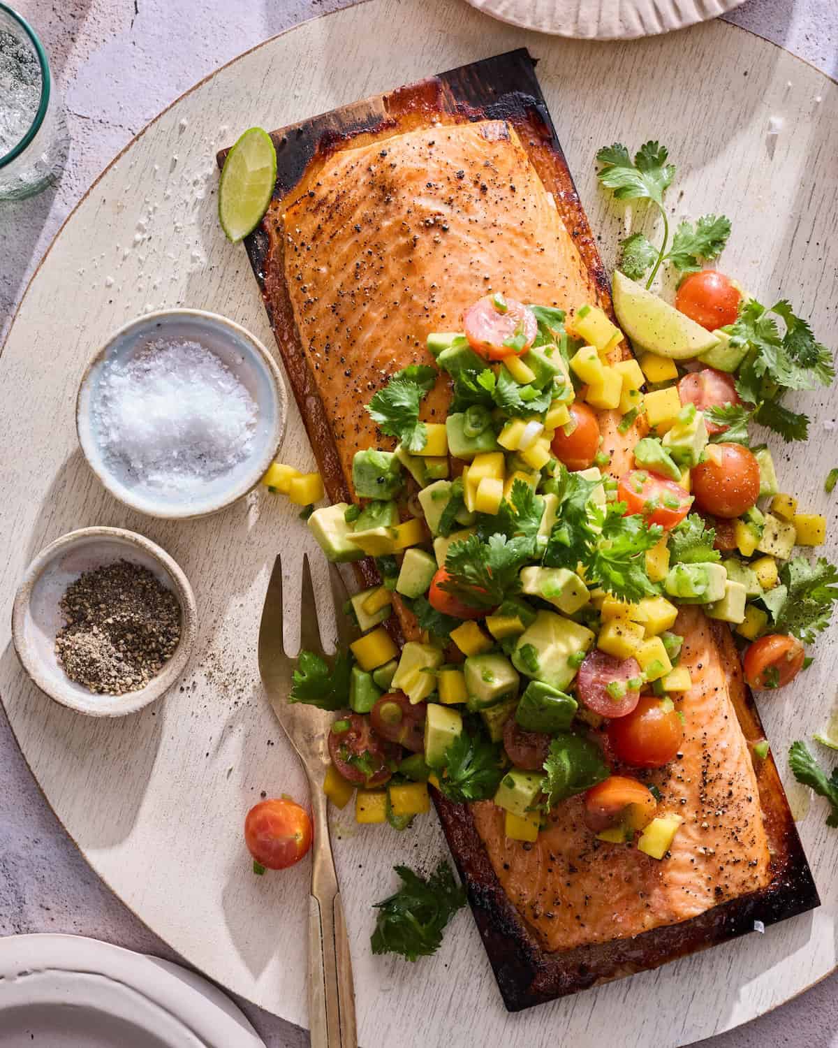 If you don’t have a cedar plank, you can roast the salmon in the oven and still top it with the salsa—same vibe, just a little less smoke.