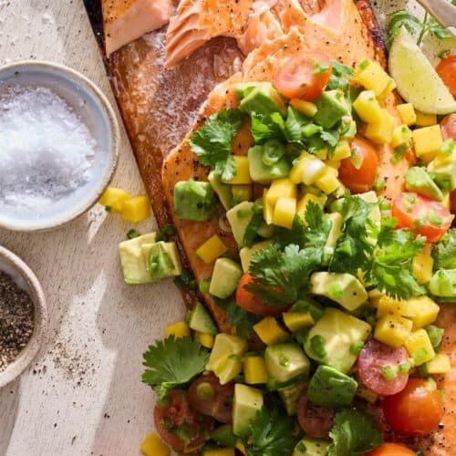 I've had been obsessed with cedar plank salmon for the past few years! I did it many moons ago with this blistered cherry tomato topping and now it's happening with a mango avocado salsa! The cedar plank gives the salmon that amazing smoky flavor without any fuss, and the mango tomato avocado salsa on top? Literal perfection. It’s light, fresh, and bursting with flavor—ideal for a dinner party, a quick weeknight meal, or honestly any excuse to fire up the grill. Plus, it's a full meal in one dish and looks so pretty on a platter!