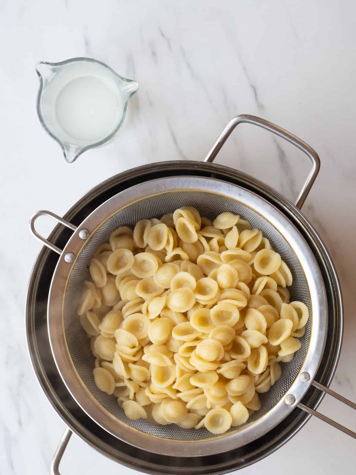 - Heat a large pot of water over high heat and bring to a boil. Once boiling, add the pasta and cook until al dente. Drain, reserving ½ cup of the pasta cooking water.