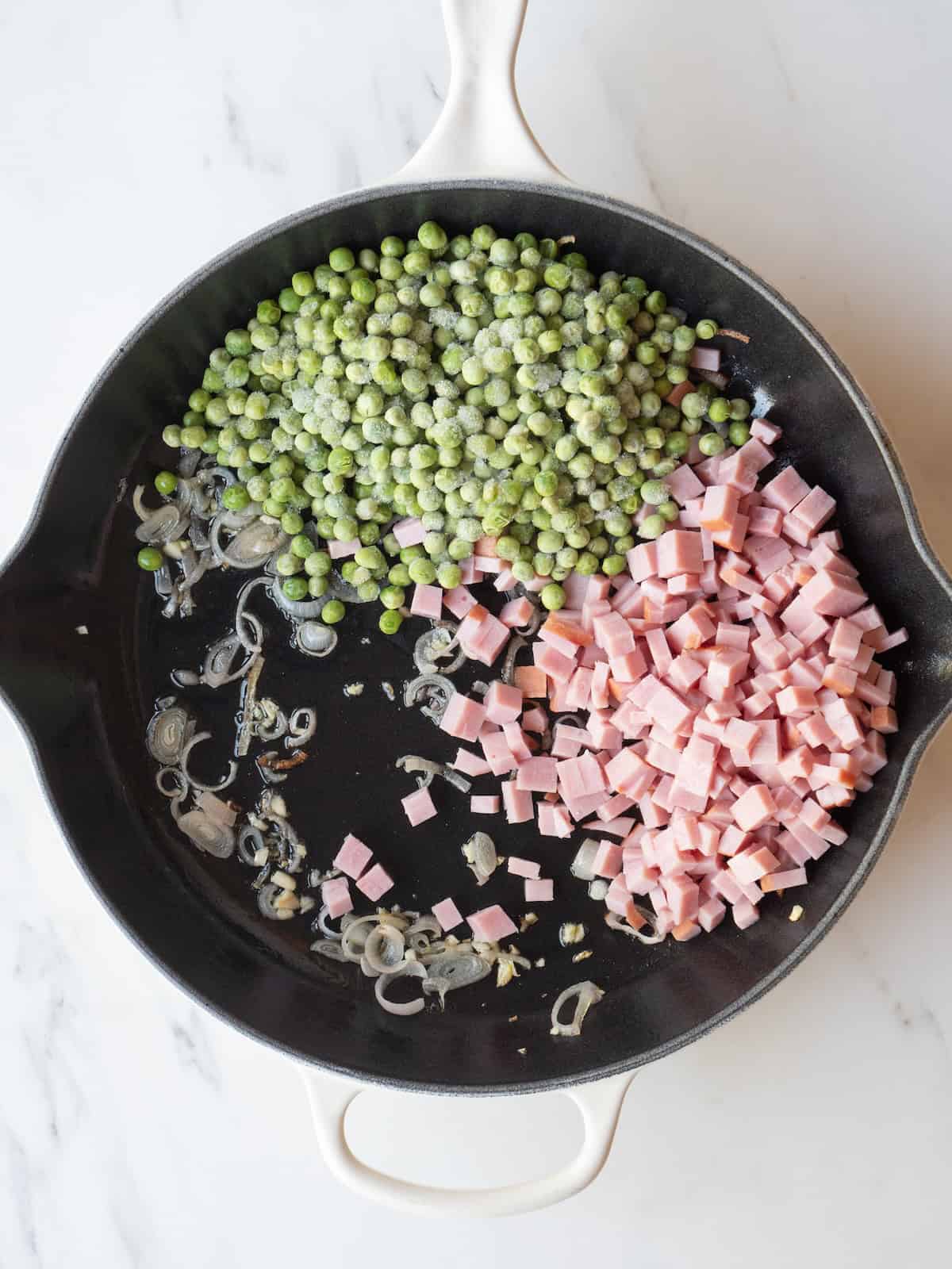 Step 4: Stir in the cubed ham and the frozen peas and toss to combine.