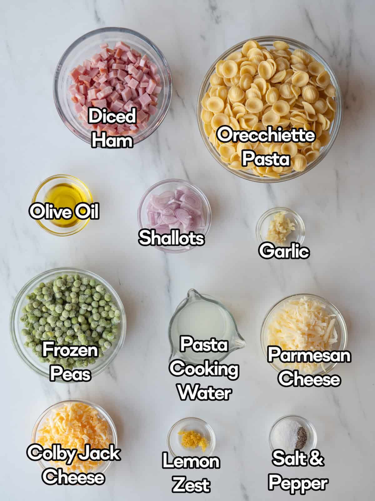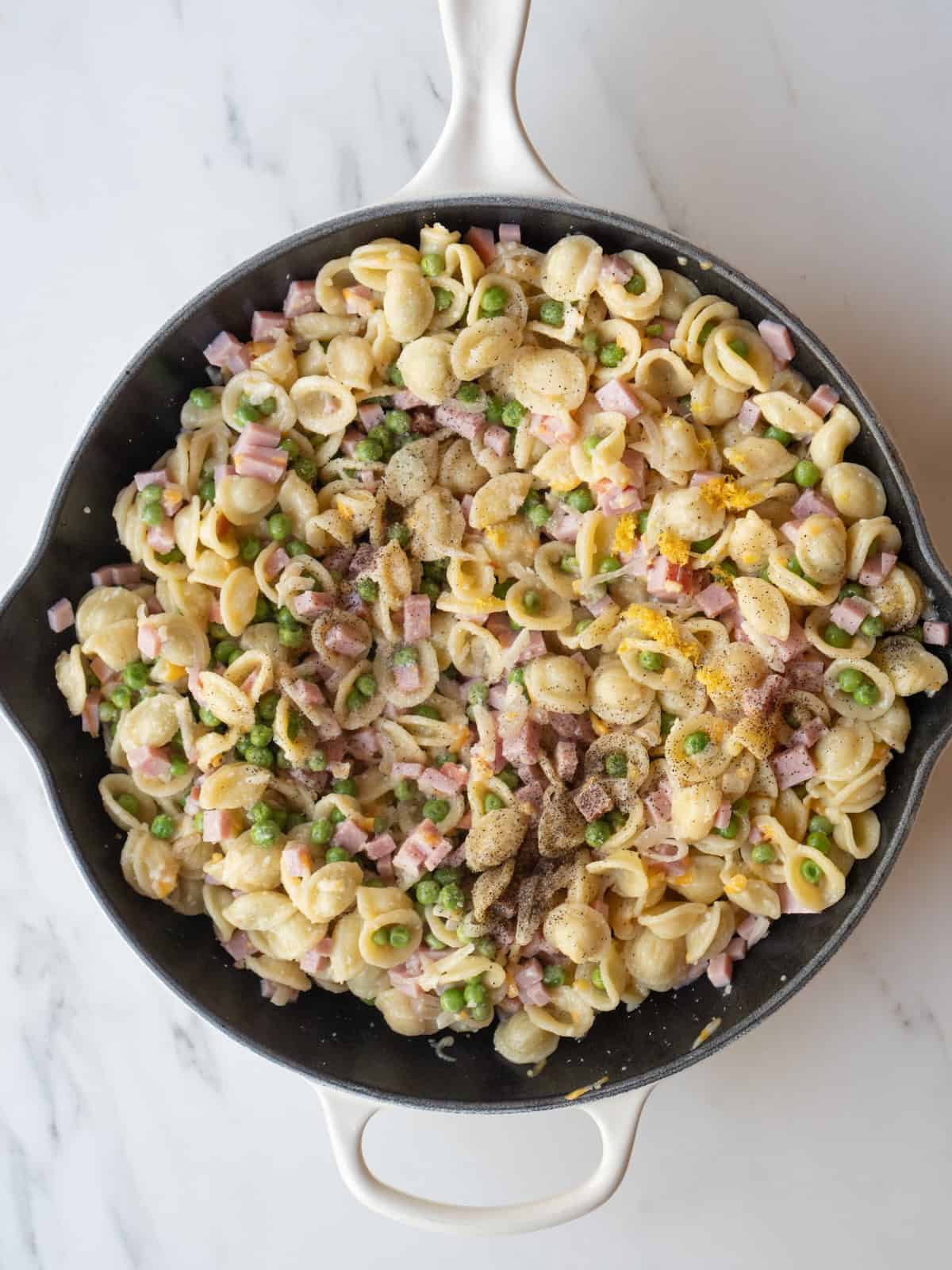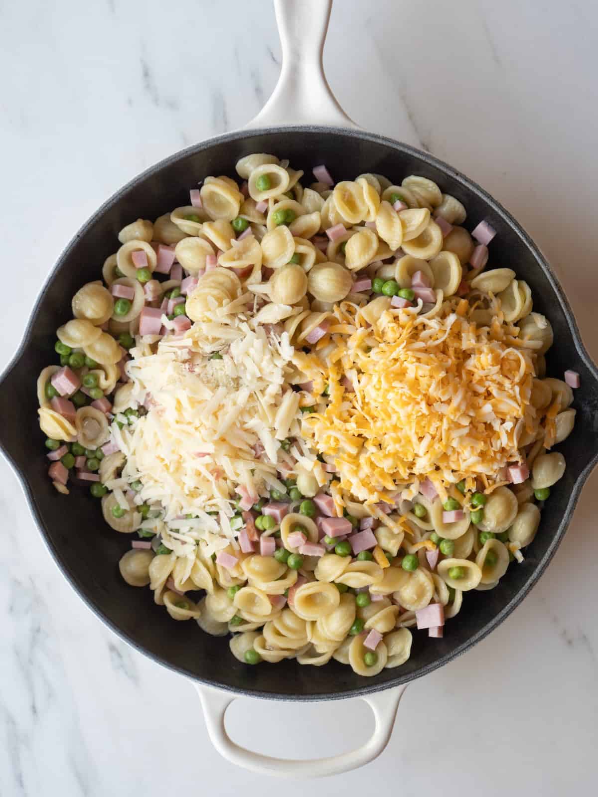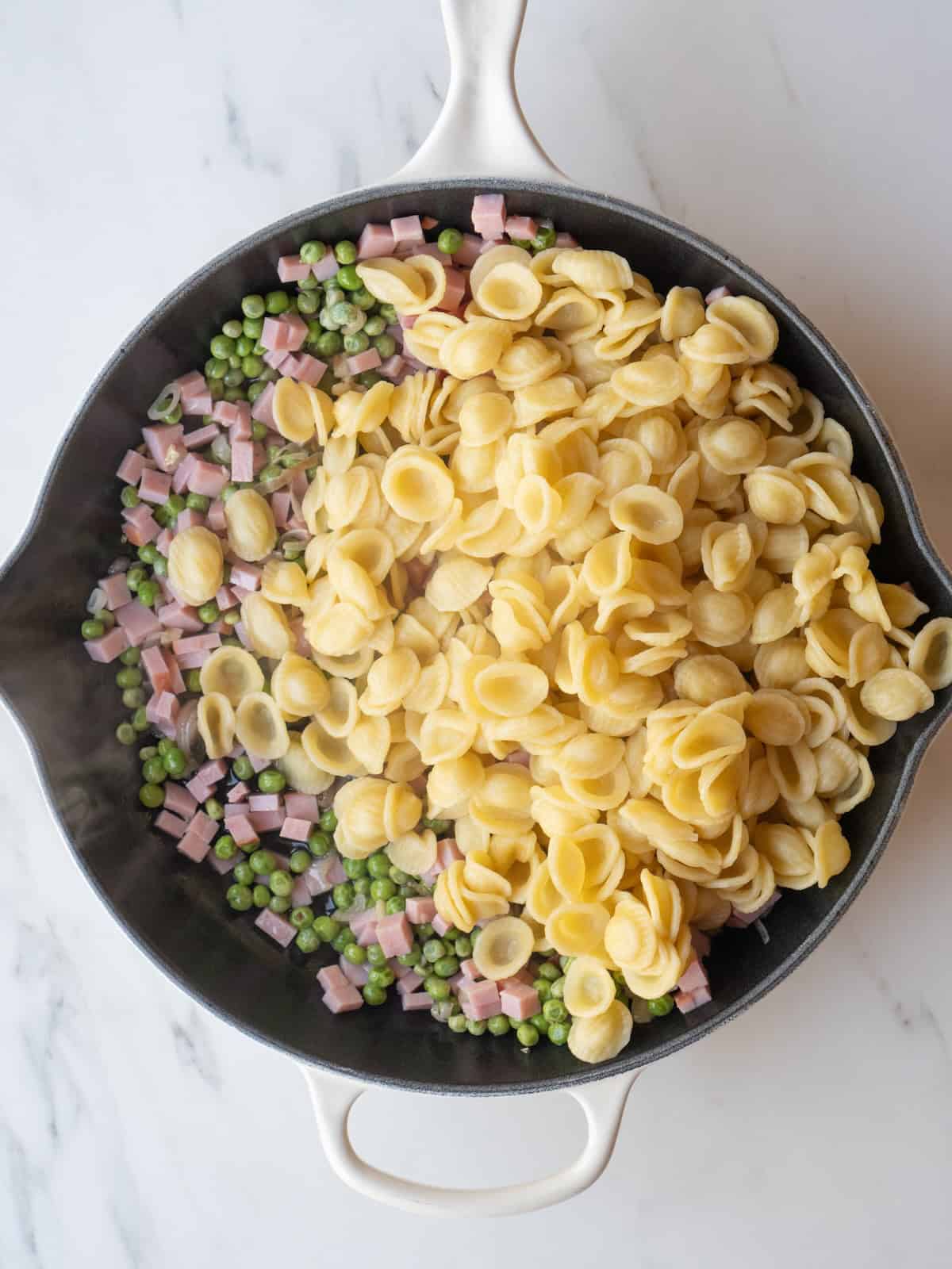 I like to use orecchiette because they are like little ears of pasta with an indent that’s perfect for catching bites of ham and cheese so each bite is loaded with plenty of flavor.